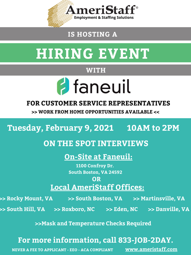 AmeriStaff is hosting a Hiring Event with Faneuil on February 9th from 10 AM to 2 PM for Customer Service Representatives! Work from home opportunities will be available. Temperature checks and masks will be required. On spot interviews will be done! We hope to see you there!